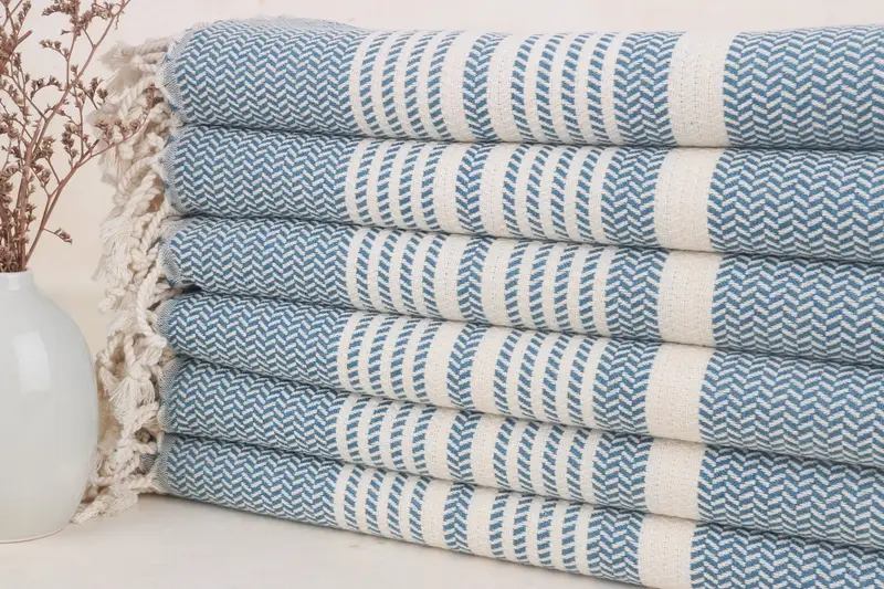 Personalisiertes Badetuch mit Petrolblau-Streifen, Beige, Bio-Baumwolle, 40 x 71 Zoll