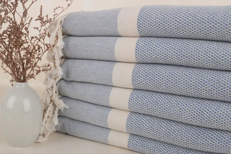 Personalisiertes hellblaues Strandtuch aus Bio-Baumwolle, beige gestreift, 36 x 71 Zoll