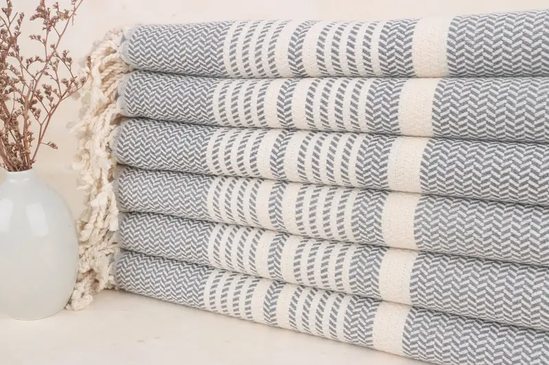 Personalisiertes dunkelgrau gestreiftes Strandtuch, Beige, Bio-Baumwolle, 40 x 71 Zoll