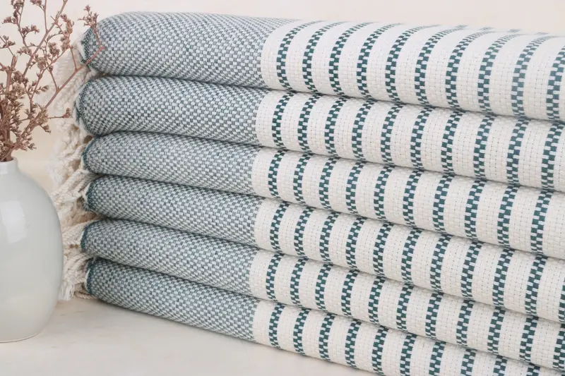 Die Handtücher bestehen aus 100 % türkischer Bio-Baumwolle und sorgen für hervorragende Saugfähigkeit und Weichheit. Die Handtücher wiegen 400 Gramm und messen 190 x 100 cm (75 x 40 Zoll), wobei aufgrund der handgefertigten Natur Abweichungen von 1 bis 2,5 cm möglich sind. Diese mit Präzision handgewebten Handtücher bieten eine individuelle Passform.