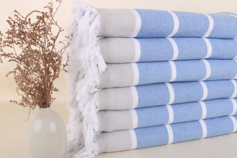 Diese Strandtücher bestehen aus 100 % türkischer Bio-Baumwolle und zeichnen sich durch hervorragende Saugfähigkeit und Weichheit aus. Um Haltbarkeit und Komfort zu gewährleisten, wird das Material sorgfältig von Hand auf Webstühlen gewebt, was zu einem Endprodukt führt, das leicht und platzsparend ist. Jedes Stück misst 100 x 170 cm (40 x 67 Zoll) mit einer Toleranz von bis zu 2,5 cm und wiegt 400 Gramm.