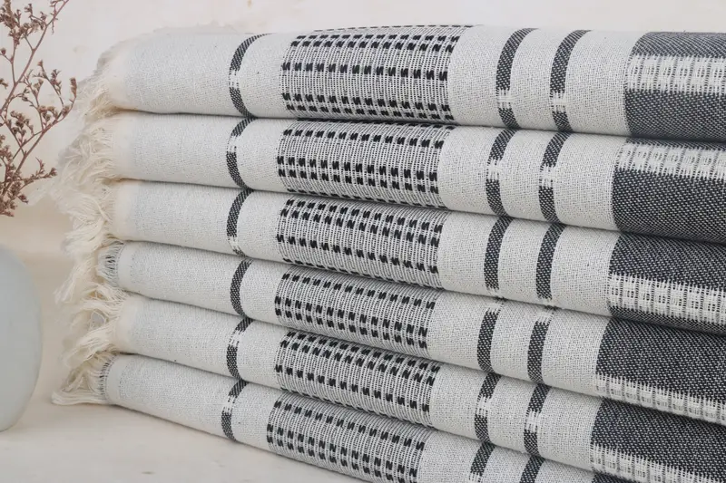 Für die Herstellung des personalisierten Geschenkbox-Handtuchs werden 100 % türkische Bio-Baumwollfasern verwendet, die eine hervorragende Weichheit und Saugfähigkeit gewährleisten. Diese Handtücher zeichnen sich durch ihr Streifendesign und die Farbgebung in Schwarz und Beige aus, was zu einer eleganten Ästhetik führt. Sie wiegen 460 Gramm und messen 90 x 170 cm (36 x 67 Zoll) mit einer zulässigen Toleranz von 1–2,5 cm aufgrund ihrer handgewebten Beschaffenheit.