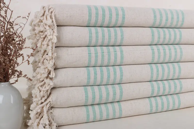 Die türkischen Strandtücher sind aus 100 % türkischer Bio-Baumwolle gefertigt und sorgen für hervorragende Weichheit und Saugfähigkeit, was zu einem luxuriösen und schnell trocknenden Erlebnis führt. Jedes Handtuch misst 40 x 71 Zoll oder 100 x 180 cm und wiegt 340 Gramm. Aufgrund der Handweberei weist es leichte Abweichungen in der Größe auf. Zu den Individualisierungsoptionen gehört das Aufsticken von Namen, Logos und Daten in bestimmten Farben und Schriftarten, wobei die Bestellungen vorgeschrumpft und für den ersten Gebrauch bereit sind.