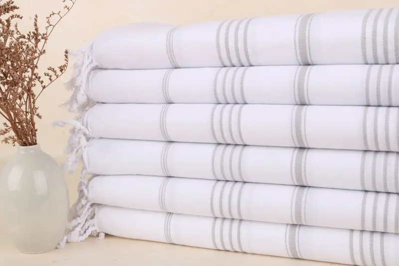 Die türkischen Handtücher zeichnen sich durch ihre Zusammensetzung aus 100 % türkischer Bio-Baumwolle aus, die eine hervorragende Saugfähigkeit und eine weiche Textur gewährleistet. Mit einem Gewicht von 300 Gramm messen diese Handtücher 40 x 71 Zoll oder 100 x 180 cm mit Toleranzen von 1–2,5 cm aufgrund ihrer handgefertigten Beschaffenheit. Abmessungen und Gewichtsangaben ermöglichen ein umfassendes Verständnis der physikalischen Eigenschaften des Produkts.