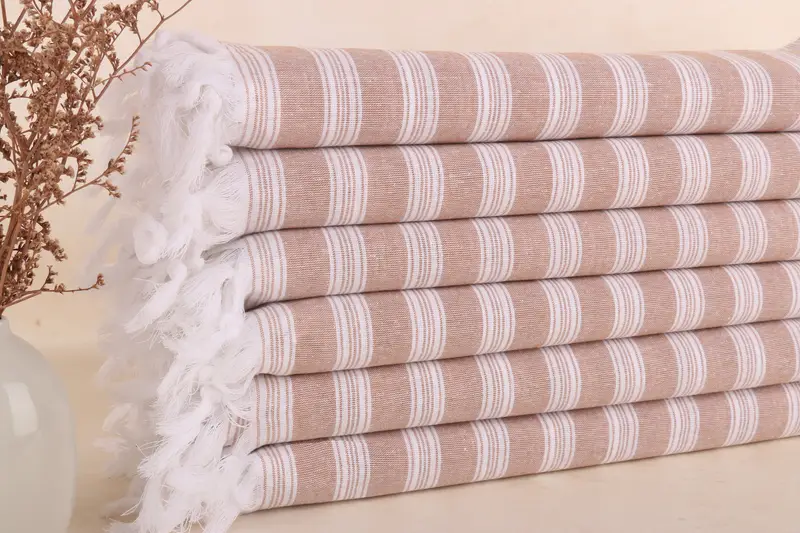 Das türkische Strandtuch zeichnet sich durch seine Faserzusammensetzung aus 100 % türkischer Bio-Baumwolle aus und sorgt für eine hohe Saugfähigkeit. Die Handtücher wiegen 210 Gramm und messen 40 x 71 Zoll oder 100 x 180 cm, mit einer geringfügigen Handwebtoleranz von bis zu 2,5 cm. Diese Abmessungen in Kombination mit ihrem geringen Gewicht ergeben ein äußerst vielseitiges Produkt, das für verschiedene Verwendungszwecke geeignet ist.