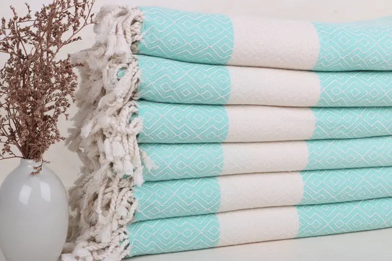 Türkische Strandtücher zeichnen sich durch ihre Zusammensetzung aus 100 % türkischer Bio-Baumwolle aus, die eine hervorragende Saugfähigkeit und Komfort gewährleistet. Diese Handtücher werden in einem Atelier sorgfältig auf Handwebstühlen gewebt, messen 38 x 67 Zoll oder 95 x 170 cm und wiegen 350 Gramm. Die Maße können aufgrund des Handwebprozesses leicht variieren.