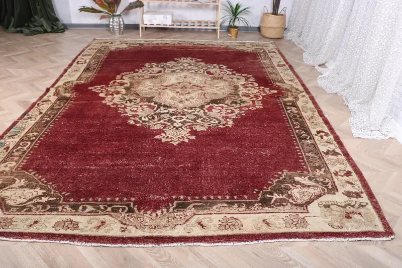 7,6 x 11 ft großer Vintage-Teppich, türkischer Übergröße-Teppich, rotbrauner Teppich mit Pflanzen und Bäumen