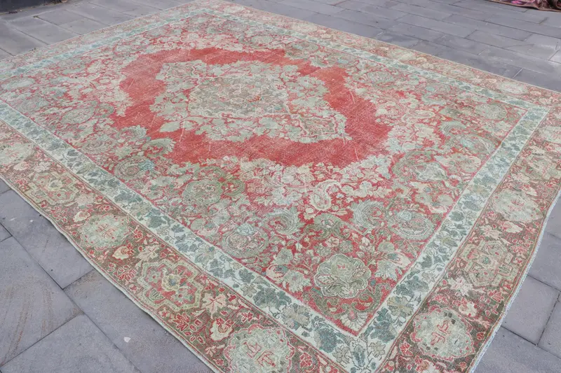 9,3x12,4 ft Teppich, türkischer Vintage Teppich, roter Ikat Wollteppich