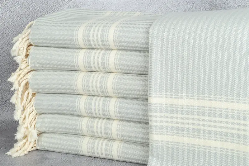 Das türkische Strandtuch zeichnet sich durch eine umweltfreundliche Premium-Baumwollzusammensetzung aus, die eine hervorragende Saugfähigkeit gewährleistet. Es misst 38 x 67 Zoll (95 x 170 cm), wiegt 290 Gramm und weist Webtoleranzen von bis zu 5 cm auf. Zu den Maßanfertigungsoptionen gehören das Monogrammieren oder die Personalisierung des Handtuchs mit Namen, Daten oder Logos.