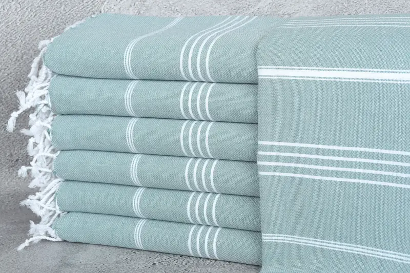 Türkische Handtücher zeichnen sich durch ihre hochwertige Zusammensetzung aus türkischer Baumwolle aus, die für Langlebigkeit und verbesserte Saugfähigkeit sorgt. Diese Handtücher mit den Maßen 40 x 71 Zoll oder 100 x 180 Zentimeter haben ein Gewicht von 280 Gramm und werden mit Handwebtechniken hergestellt, die eine Toleranz von 2 Zoll oder 5 Zentimetern verursachen können. Das Ergebnis ist ein vielseitiges Produkt, das für verschiedene Verwendungszwecke geeignet ist. Die Handtücher sind vorgeschrumpft, um ihre Größe beizubehalten.