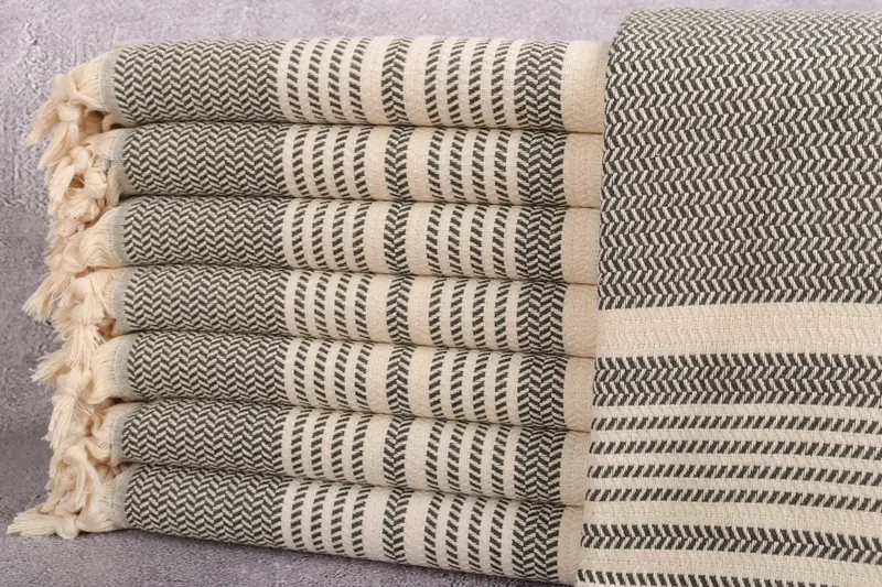 Hochwertige türkische Baumwolle sorgt für hervorragende Saugfähigkeit und Haltbarkeit und eignet sich für verschiedene Verwendungszwecke, von Küchen- und Badetüchern bis hin zu Strand- und Reiseutensilien. Diese Handtücher zeichnen sich durch Abmessungen von 100 x 180 Zentimetern (40 x 71 Zoll) und ein Gewicht von 420 Gramm aus und ermöglichen eine Webtoleranz von 5 cm (2 Zoll). Jedes Handtuch wird sorgfältig verarbeitet, um sicherzustellen, dass es vorgeschrumpft und sofort einsatzbereit ist.