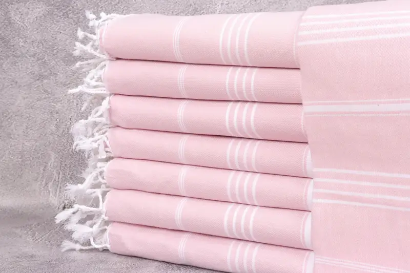 Peshtemal-Handtücher zeichnen sich durch ihre Zusammensetzung aus türkischer Bio-Baumwolle aus und sorgen für außergewöhnliche Saugfähigkeit und Weichheit, wodurch sie für verschiedene Zwecke vielseitig einsetzbar sind. Sie wiegen pro Handtuch 265 Gramm und werden sorgfältig von Hand in den Maßen 100 x 180 cm (40 x 71 Zoll) gewebt. Aufgrund der Webtechnik kann die Größe innerhalb einer Toleranz von 2 Zoll bzw. 5 cm variieren.