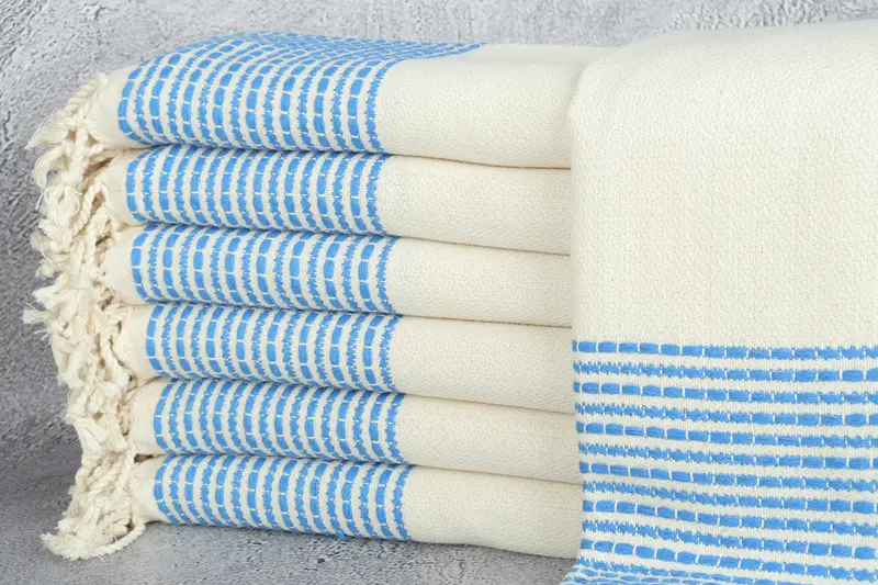 Türkische Handtücher zeichnen sich durch ihre türkische Bio-Baumwolle aus, die für maximale Saugfähigkeit und Weichheit sorgt. Diese Handtücher mit den Maßen 36 x 69 Zoll oder 90 x 175 Zentimeter sind mit 460 Gramm leicht und werden durch sorgfältiges Handweben hergestellt, das eine Größentoleranz von 1 bis 2,5 Zentimetern zulässt.