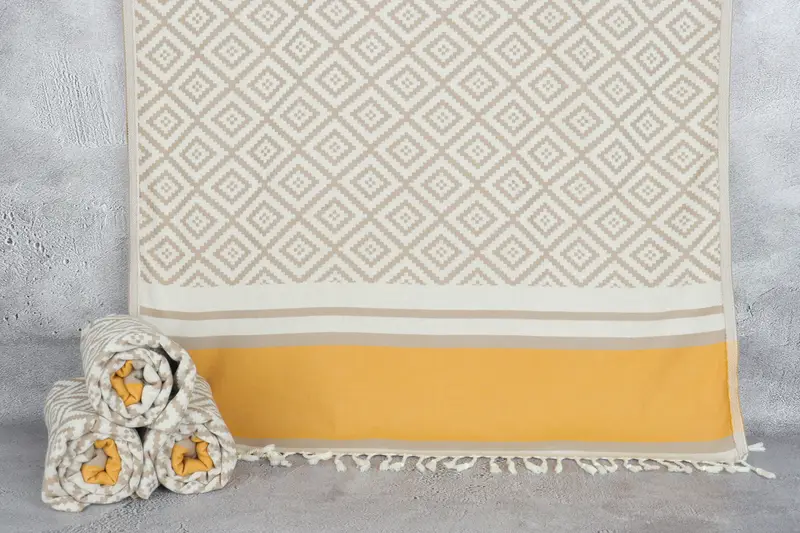 Umweltfreundliche türkische Premium-Baumwolle prägt die Faserzusammensetzung und sorgt für eine hervorragende Saugfähigkeit. Die türkischen Handtücher mit den Maßen 36x69 Zoll bzw. 90x175 Zentimeter wiegen 420 Gramm. Durch den Handwebprozess ergibt sich eine Größentoleranz von 2 Zoll bzw. 5 Zentimetern.