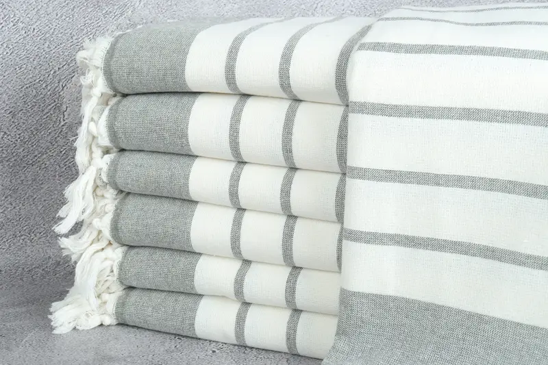 Das Material dieser Strandtücher besteht aus türkischer Bio-Baumwolle, die für ihre Strapazierfähigkeit und Saugfähigkeit bekannt ist. Um höchste Qualität zu gewährleisten, werden diese Handtücher aus umweltfreundlicher türkischer Premium-Baumwolle hergestellt, was zu einem leichten und dennoch robusten Textil führt. Mit einem Gewicht von 422 Gramm und einer Abmessung von 98 x 170 Zentimetern (39 x 67 Zoll) weisen diese Handtücher aufgrund der Handwebung eine leichte Toleranz von ± 2 Zoll oder 5 Zentimetern auf.