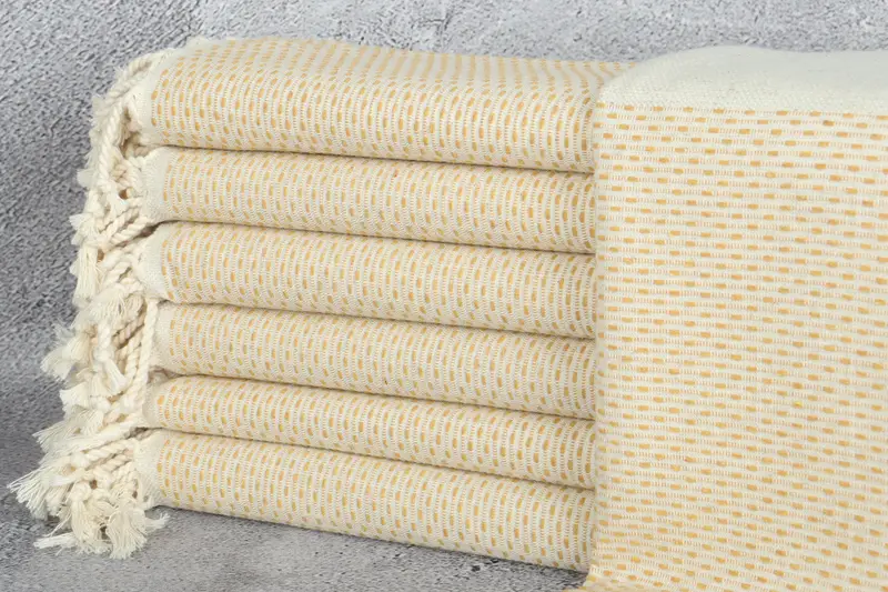 Die Materialzusammensetzung des Monogram-Strandtuchs, des individuellen türkischen Handtuchs, des senffarbenen Handtuchs und des Leinenhandtuchs zeichnet sich durch UMWELTFREUNDLICHE Premium-türkische Baumwolle aus, die ein weiches und leichtes Handtuch gewährleistet. Jedes Handtuch ist handgewebt, was zu einer Standardgröße von 100 x 180 Zentimetern (40 x 71 Zoll) mit einer Handwebtoleranz von 2 Zoll oder 5 Zentimetern führt. Das Gewicht der Handtücher beträgt genau 480 Gramm.