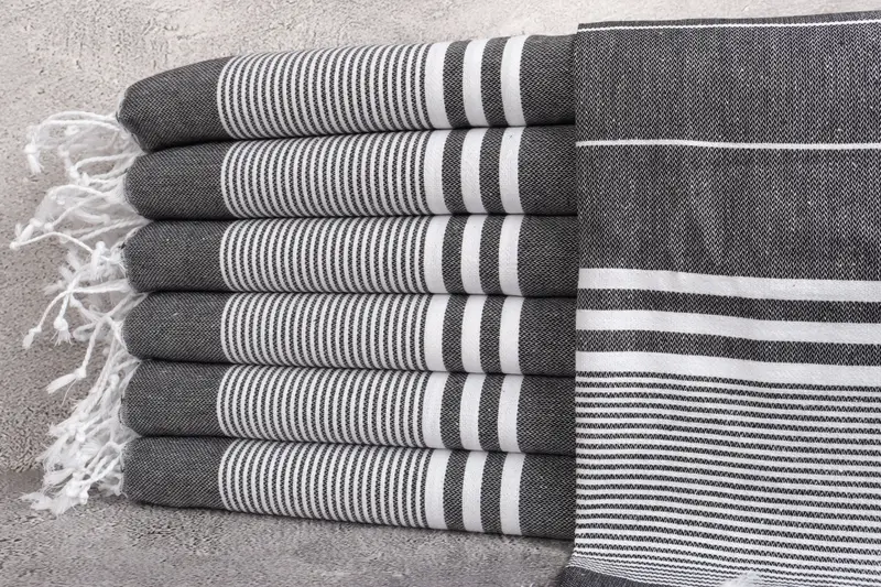 Türkische Handtücher zeichnen sich durch ihre flachgewebte Konstruktion aus, die ein minimales Volumen und eine hohe Vielseitigkeit gewährleistet. Diese Handtücher bestehen aus umweltfreundlicher türkischer Premium-Baumwolle und weisen eine bemerkenswerte Saugfähigkeit auf, wobei eine typische Wäsche ihre Weichheit erhöht. Jedes Handtuch misst 24 x 40 Zoll (60 x 100 Zentimeter) und wiegt 120 Gramm, mit einer Handwebtoleranz von bis zu 5 Zentimetern.
