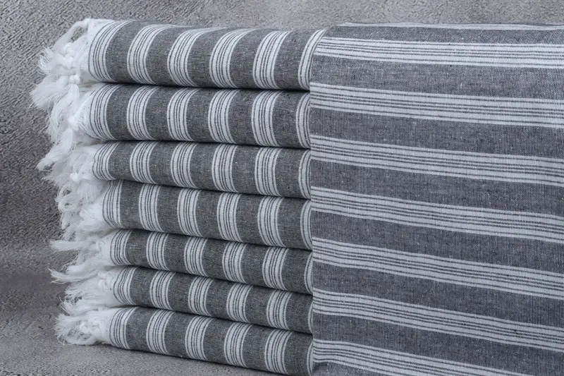 Türkische Handtücher zeichnen sich durch ihre Flachgewebekonstruktion aus und sind aus hochwertiger türkischer Baumwolle gefertigt, die eine hervorragende Saugfähigkeit und Weichheit gewährleistet. Jedes Handtuch wird sorgfältig von Hand gewebt, was zu Abmessungen von 40 x 71 Zoll oder 100 x 180 Zentimetern und einem Gewicht von 210 Gramm führt. Die Webtoleranzen können bei Einhaltung traditioneller Techniken um bis zu 2 Zoll oder 5 Zentimeter variieren.