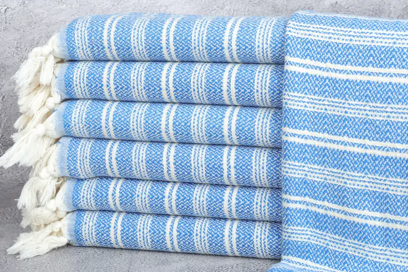Diese aus türkischer Bio-Baumwolle gefertigten Handtücher zeichnen sich durch hervorragende Saugfähigkeit und Haltbarkeit aus. Diese Handtücher zeichnen sich durch eine leichte und flachgewebte Struktur aus und erreichen Abmessungen von 18 x 32 Zoll oder 45 x 80 Zentimetern, mit einer leichten Handwebtoleranz von 2 Zoll oder 5 Zentimetern. Sie sind für ein Gewicht von 120 Gramm pro Handtuch ausgelegt.