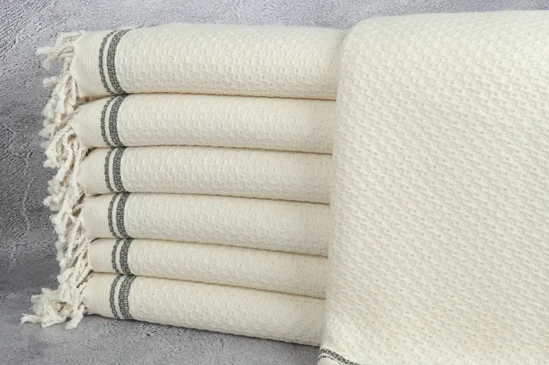 Türkische Strandtücher zeichnen sich durch ihre Faserzusammensetzung aus, die durch UMWELTFREUNDLICHE Premium-Türkische Baumwolle gekennzeichnet ist und eine hohe Saugfähigkeit und Haltbarkeit gewährleistet. Diese Handtücher sind sorgfältig gewebt, was zu einer einheitlichen Größe von 90 x 170 Zentimetern (36 x 67 Zoll) führt. Das Gewicht jedes Handtuchs beträgt 440 Gramm.