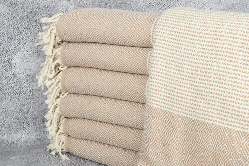 Umweltfreundliche türkische Premium-Baumwolle zeichnet das 40 x 71 Zoll große hellbraune Baumwollhandtuch aus und sorgt für hohe Saugfähigkeit und weiche Textur. Jedes Stück wiegt 450 Gramm und wird sorgfältig von Hand gewebt, was zu einer Größentoleranz von 2 Zoll oder 5 Zentimetern führt. Die Handtücher sind vorgeschrumpft, sodass kein zusätzliches Schrumpfen nach dem Waschen erforderlich ist.