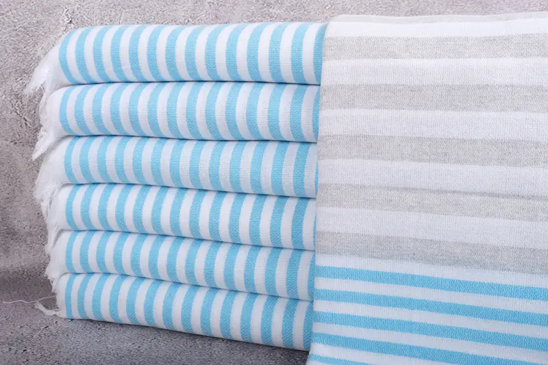 Unsere Kollektion zeichnet sich durch hochwertige türkische Bio-Baumwolle aus, die eine außergewöhnliche Saugfähigkeit und Haltbarkeit gewährleistet. Die türkischen Handtücher haben eine Größe von 100 x 180 Zentimetern und wiegen etwa 300 Gramm. Diese Handtücher weisen eine Handwebtoleranz von bis zu 2 Zoll oder 5 Zentimetern auf.
