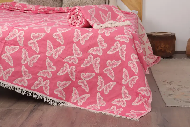 Fuchsia-Überwurf mit Schmetterlingsmuster, Baumwolldecke, 79 x 95 Zoll