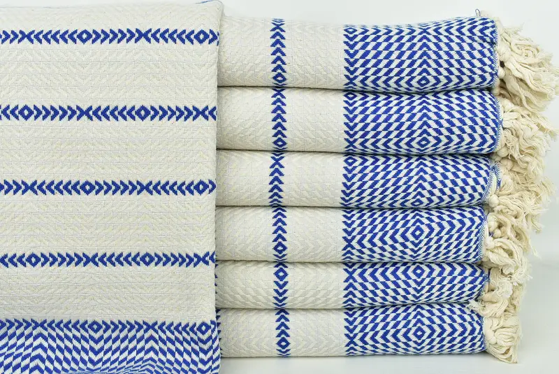 Hochwertige türkische Baumwolle ist das Grundmaterial, das eine außergewöhnliche Saugfähigkeit und schnelle Trocknung gewährleistet. Diese Handtücher zeichnen sich durch eine Abmessung von 100 x 200 cm (40 x 79 Zoll) mit einer zulässigen Toleranz von bis zu 2,5 cm aus und wiegen etwa 460 Gramm. Bei jedem handgewebten Stück kann die endgültige Größe um 1–2 cm abweichen.