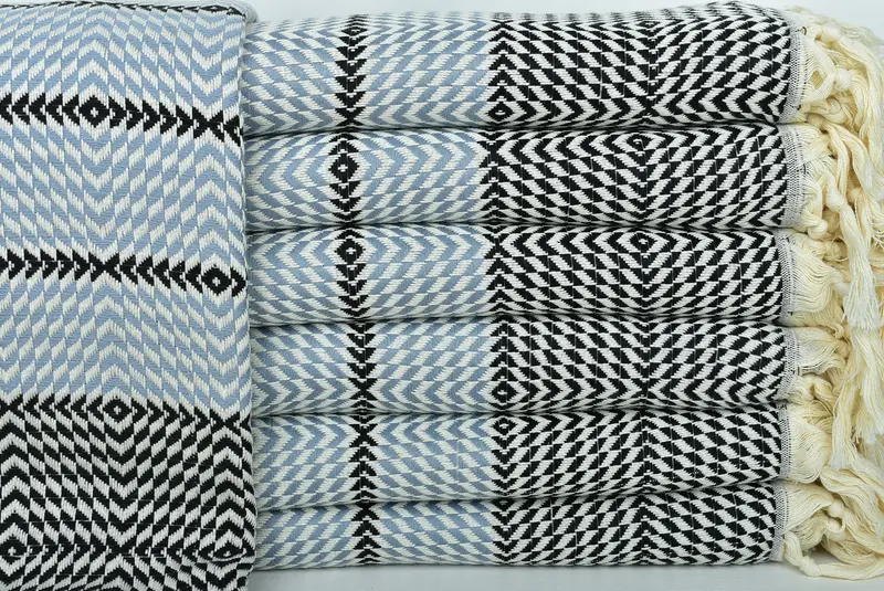Hochwertige Handtücher aus türkischer Baumwolle zeichnen sich durch hohe Saugfähigkeit und schnell trocknende Eigenschaften aus. Um einen minimalen Wasserverbrauch bei der Produktion zu gewährleisten, werden diese Handtücher auf traditionellen Handwebstühlen gewebt, was zu einer leicht variierenden Größe innerhalb einer Toleranz von 1–2,5 cm führt. Jedes Handtuch wiegt etwa 460 Gramm und misst 40 x 79 Zoll oder 100 x 200 cm, was Vielseitigkeit für mehrere Verwendungszwecke bietet.