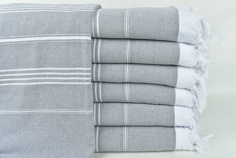 Türkische Handtücher werden aus türkischer Baumwolle hergestellt und gewährleisten eine hervorragende Saugfähigkeit und schnelles Trocknen. Gekennzeichnet durch die traditionelle Handweberei beträgt die Toleranz 1–2,5 cm. Die Handtücher haben eine Größe von 36 x 71 Zoll oder 90 x 180 cm und ein Gewicht von ca. 400 Gramm.