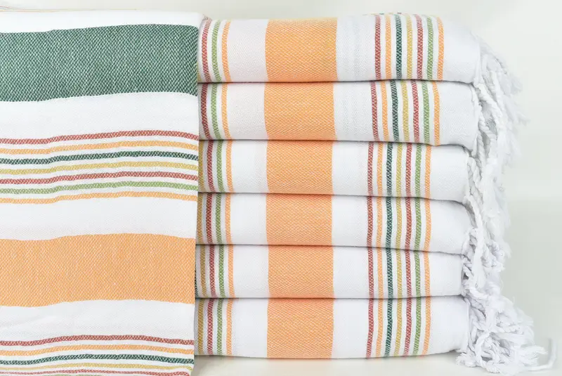 Türkische Baumwolle zeichnet sich durch eine außergewöhnliche Wasseraufnahmefähigkeit und schnelle Trocknungseigenschaften aus und gewährleistet eine effiziente Verwendung als Bade-, Strand- oder Poolhandtuch. Türkische Handtücher haben die Maße 95 x 190 cm (38 x 75 Zoll), mit einer Toleranz von 1 bis 2,5 cm und einem Gewicht von etwa 240 Gramm. Diese handgewebte Konstruktion ergibt ein weiches, umweltfreundliches Handtuch, das für mehrere Verwendungszwecke geeignet ist.