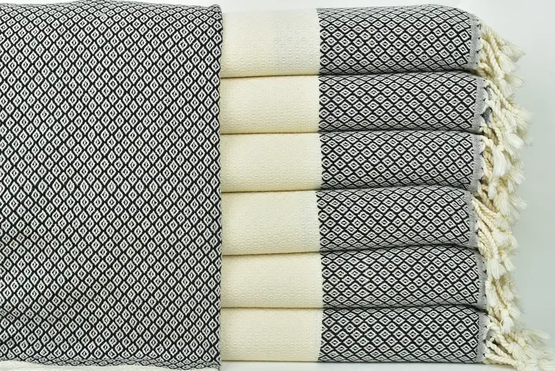 Türkische Baumwolle sorgt für eine hervorragende Saugfähigkeit und sorgt dafür, dass Handtücher sehr schnell trocknen, ohne dass ein Trockner erforderlich ist. Es zeichnet sich durch sein einzigartiges Handwebverfahren aus, das zu einer leichten Größentoleranz von 1–2,5 cm führt. Jedes Handtuch misst 90 x 180 cm (36 x 71 Zoll) und wiegt etwa 380 Gramm.