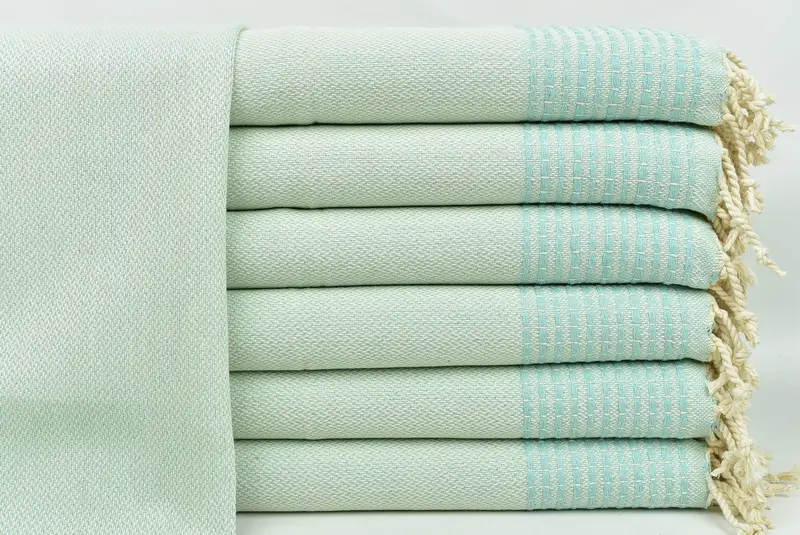 Hochwertiges türkisches Baumwollmaterial sorgt für hervorragende Saugfähigkeit und schnelle Trocknungszeiten, gekennzeichnet durch die traditionelle Handwebtechnik. Die Abmessungen des Handtuchs betragen 20 x 40 Zoll oder 50 x 100 cm mit zulässigen Abweichungen von 1–2,5 cm. Das Gewicht jedes Handtuchs beträgt ca. 120 Gramm, was Haltbarkeit und Weichheit gewährleistet.