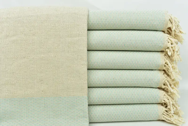 Der Stoff dieser handgefertigten Handtücher besteht aus hochwertiger türkischer Baumwolle, die für ihre hervorragende Saugfähigkeit bekannt ist. Um eine schnelle Trocknung und einen minimalen Wasserverbrauch zu gewährleisten, werden die Handtücher auf traditionellen Handwebstühlen gewebt, wobei die Größentoleranzen zwischen 40 x 71 Zoll und 100 x 180 cm liegen. Jedes Stück wiegt etwa 480 Gramm und ist auf eine gleichbleibende Qualität ausgelegt.