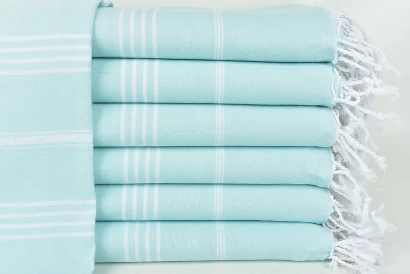 Türkische Handtücher zeichnen sich durch die Verwendung hochwertiger türkischer Baumwolle aus, die eine hohe Saugfähigkeit und Weichheit gewährleistet. Dieses Material ist für seine schnell trocknenden Eigenschaften bekannt und erfordert bei der Herstellung weniger Wasser und Energie. Die Handtücher messen 40 x 71 Zoll oder 100 x 180 cm mit einer möglichen Toleranz von 1–2,5 cm. Jedes türkische Handtuch wiegt etwa 280 Gramm.
