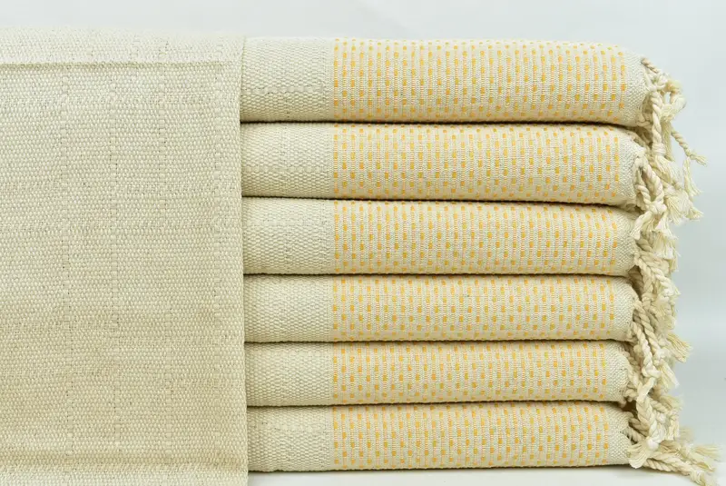 Die aus hochwertiger türkischer Baumwolle gefertigten Handtücher gewährleisten eine hervorragende Saugfähigkeit und schnelle Trocknungseigenschaften. Das Ergebnis ist ein leichtes und langlebiges Produkt. Die Handtücher werden auf traditionellen Webstühlen handgewebt und haben Abmessungen von 20 x 40 Zoll oder 50 x 100 Zentimetern, was eine Größenabweichung von 5 cm zulässt. Jedes Handtuch wiegt etwa 120 Gramm und ist vorgeschrumpft, um seine Form zu behalten.