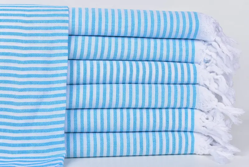 Türkische Handtücher zeichnen sich durch die Verwendung hochwertiger türkischer Baumwolle aus, die im Vergleich zu herkömmlichen Handtüchern eine höhere Weichheit und schnelle Trocknungszeiten gewährleistet. Characterized by their absorbency and light weight of approximately 200 grams, these towels are meticulously hand-loomed with a tolerance of 1-2.5 cm.