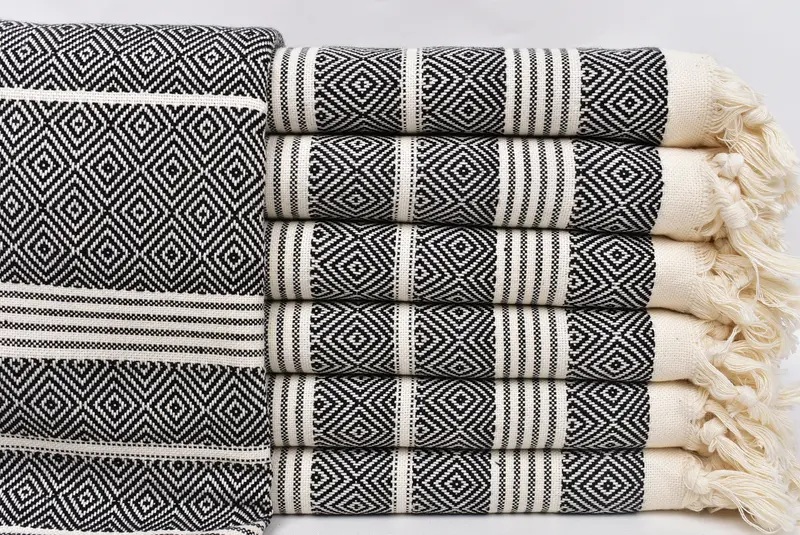 Diese aus hochwertiger türkischer Baumwolle gefertigten Handtücher zeichnen sich durch außergewöhnliche Saugfähigkeit und schnelle Trocknungszeiten aus. Ihre robuste Faserzusammensetzung sorgt für Langlebigkeit, während ihr geringes Gewicht den Benutzerkomfort erhöht. Die Toleranz für Handwebmaße beträgt 1–2,5 cm und reicht von 38 x 69 Zoll (95 x 175 cm).