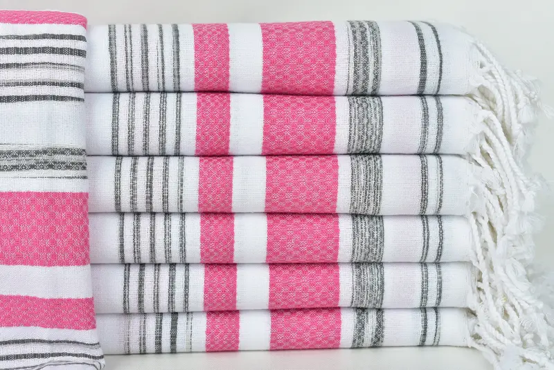 Handtücher aus türkischer Baumwolle zeichnen sich durch hohe Saugfähigkeit und schnelle Trocknungsfähigkeit aus und sorgen bei der Herstellung für einen minimalen Wasserverbrauch. Diese auf traditionellen Handwebstühlen gewebten Handtücher weisen ein typisches Gewicht von etwa 300 Gramm und Abmessungen von 38 x 71 Zoll auf, was 95 x 180 Zentimetern mit einer Toleranz von 1–2,5 cm entspricht.