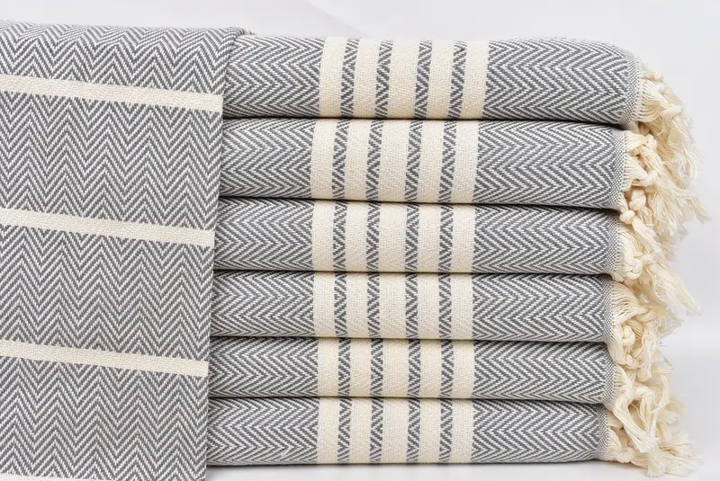 Türkische Handtücher werden aus hochwertiger türkischer Baumwolle hergestellt und gewährleisten im Vergleich zu herkömmlichen Handtüchern eine hervorragende Saugfähigkeit und schnelle Trocknungsfähigkeit. Die Faserzusammensetzung, die sich durch außergewöhnliche Weichheit und Wasseraufnahmeeigenschaften auszeichnet, zeichnet diese Handtücher aus. Diese Handtücher sind ein leichtes und dennoch langlebiges Produkt und wiegen etwa 110 Gramm bei Abmessungen von 20 x 40 Zoll (50 x 100 cm) mit einer Toleranz von bis zu 5 cm.