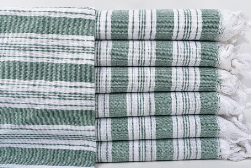 Türkische Handtücher zeichnen sich durch ihre Faserzusammensetzung aus, insbesondere aus hochwertiger türkischer Baumwolle, die eine hervorragende Saugfähigkeit und Weichheit gewährleistet. Jedes Handtuch hat ein Gewicht von ca. 124 Gramm und misst 100 x 180 cm (40 x 71 Zoll), mit einer Toleranz von bis zu 1–2,5 cm. Aufgrund dieser Abmessungen eignen sie sich für eine Reihe von Anwendungen, vom Bad bis zum Reisen.