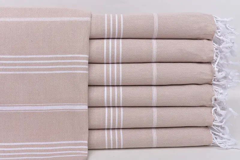 Es wird hochwertige türkische Baumwolle verwendet, die eine hohe Saugfähigkeit und schnelles Trocknen gewährleistet, was zu einem weichen und leichten Handtuch führt. Gekennzeichnet durch eine Größe von 100 x 180 cm (40 x 71 Zoll), mit geringfügigen Abweichungen von bis zu 5 cm, beträgt das Gewicht etwa 265 Gramm. Jedes Stück wird durch traditionelle Handweberei gefertigt, wodurch geringfügige Abweichungen in den Abmessungen möglich sind.