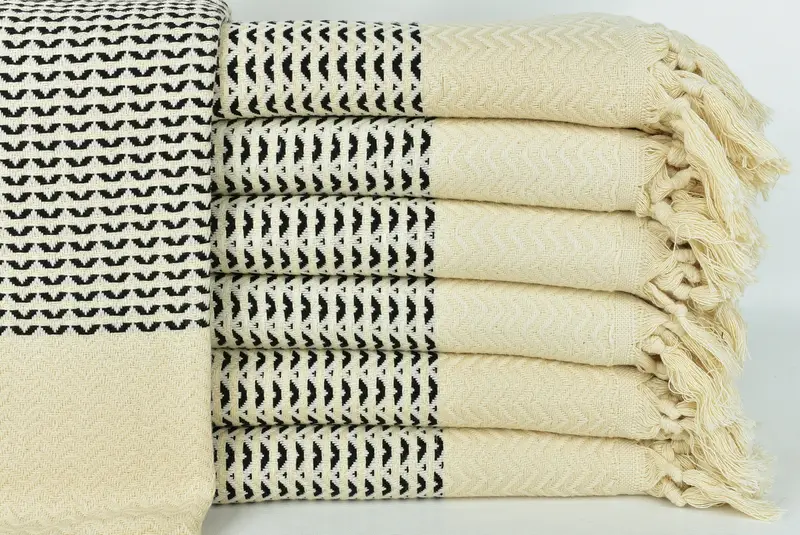 Türkische Handtücher zeichnen sich durch die Verwendung hochwertiger türkischer Baumwolle aus und sorgen für eine außergewöhnliche Wasseraufnahmefähigkeit und schnelle Trocknung. Das Ergebnis sind hochwertige Bade- und Strandtücher. Die natürliche Weichheit des Materials trägt zur Leichtigkeit der Handtücher bei. Die türkischen Handtücher haben eine Standardgröße von 40 x 77 Zoll (100 x 195 cm), haben eine Toleranz von ±2,5 cm und ein Gewicht von ca. 390 Gramm.
