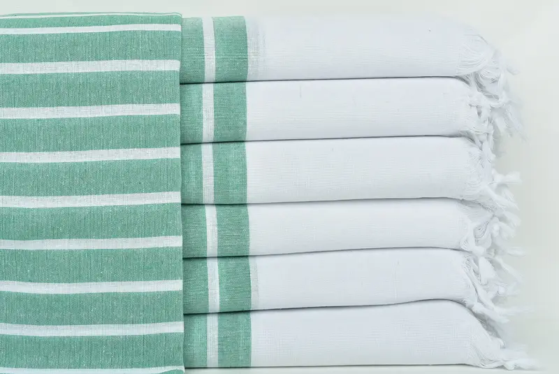 Das türkische Handtuch zeichnet sich durch seine hervorragende Saugfähigkeit aus und ist aus hochwertiger türkischer Baumwolle gewebt, was eine effiziente Wasseraufnahme und schnelle Trocknungszeiten gewährleistet. Die Abmessungen des Handtuchs betragen 40 x 71 Zoll oder 100 x 180 cm, mit einer Toleranz von bis zu 5 cm in beide Richtungen, und es wiegt etwa 220 Gramm. Jedes mit traditionellen Techniken handgewebte Handtuch ist vorgeschrumpft und gebrauchsfertig.