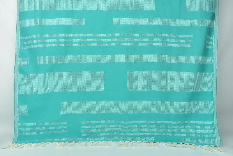 Hochwertige türkische Baumwolle sorgt für hervorragende Saugfähigkeit und schnelle Trocknungszeiten. Gekennzeichnet durch eine Breite von 38 Zoll und eine Länge von 67 Zoll, was 95 Zentimeter mal 170 Zentimeter entspricht, mit einer leichten Toleranz von ±2,5 cm. Das Strandtuch wiegt etwa 400 Gramm und wird auf traditionellen Handwebstühlen hergestellt, wodurch geringfügige Maßabweichungen möglich sind.