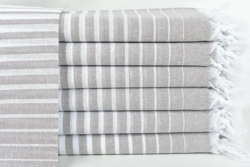 Türkische Peshtemal-Handtücher zeichnen sich durch ihr hochwertiges türkisches Baumwollmaterial aus, das eine außergewöhnliche Wasseraufnahmefähigkeit und schnelle Trocknungszeiten gewährleistet. Diese etwa 240 Gramm schweren Handtücher werden in der Türkei sorgfältig von Hand gewebt. Jedes Stück misst 40 x 69 Zoll oder 100 x 175 cm, was eine Toleranz von bis zu 2,5 cm zulässt. Zu den verschiedenen Unterkategorien gehören Strandtücher, Badetücher und Poolhandtücher, die für verschiedene Zwecke wie Spa, Fitness und Reisen geeignet sind.