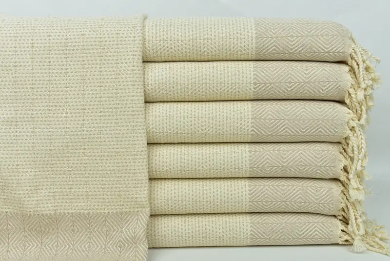 Türkische Handtücher zeichnen sich durch ihre Zusammensetzung aus hochwertiger türkischer Baumwolle aus, die eine außergewöhnliche Saugfähigkeit und schnelle Trocknung gewährleistet. Dies führt zu einer hohen Nachfrage nach Anwendungen wie Küchentüchern, Geschirrtüchern und für den persönlichen Gebrauch. Diese Handtücher haben Abmessungen von 18 x 36 Zoll oder 45 x 90 cm mit einer Toleranz von 1–2,5 cm und wiegen etwa 122 Gramm, was ein Gleichgewicht zwischen geringem Gewicht und Haltbarkeit bietet.