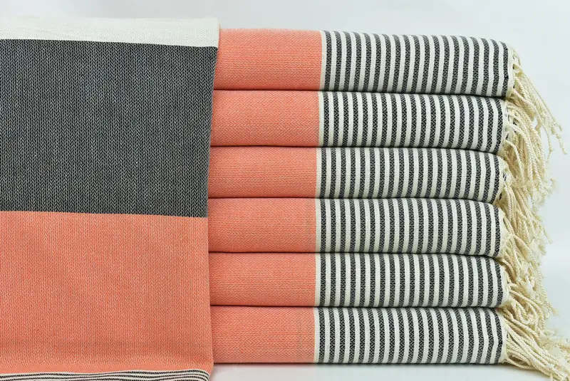 Türkische Handtücher werden aus hochwertiger türkischer Baumwolle hergestellt und zeichnen sich durch außergewöhnliche Saugfähigkeit und weiche Textur aus. Um eine optimale Leistung zu gewährleisten, messen die Handtücher 40 x 69 Zoll oder 100 x 174 cm mit einer Toleranz von bis zu 1–2,5 cm. Diese Handtücher wiegen etwa 298 Gramm und werden mit traditionellen Techniken handgewebt.