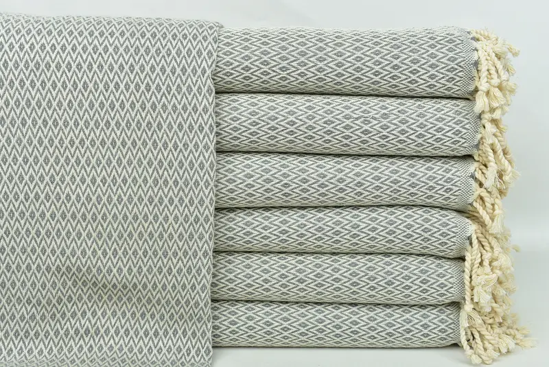 Türkische Handtücher zeichnen sich durch ihre hochwertige Zusammensetzung aus türkischer Baumwolle aus, die eine hervorragende Saugfähigkeit und schnelle Trocknungseigenschaften gewährleistet. Die Handtücher werden traditionell von Hand gewebt, was zu einer leichten Maßabweichung von 1–2,5 cm führt. Jedes Handtuch misst 100 x 180 cm (40 x 71 Zoll) und wiegt etwa 400 Gramm.