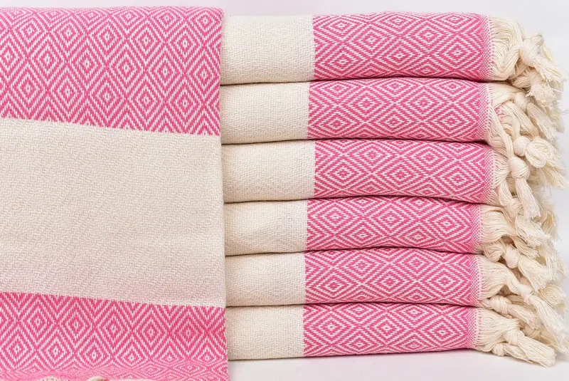 Türkische Baumwolle sorgt für eine außergewöhnliche Saugfähigkeit, was zu schnell trocknenden Handtüchern führt. Diese Handtücher zeichnen sich durch die Maße 100 x 180 cm (40 x 71 Zoll) aus und wiegen etwa 420 Gramm. Handwebtoleranzen erlauben eine Größenabweichung von bis zu 5 cm.